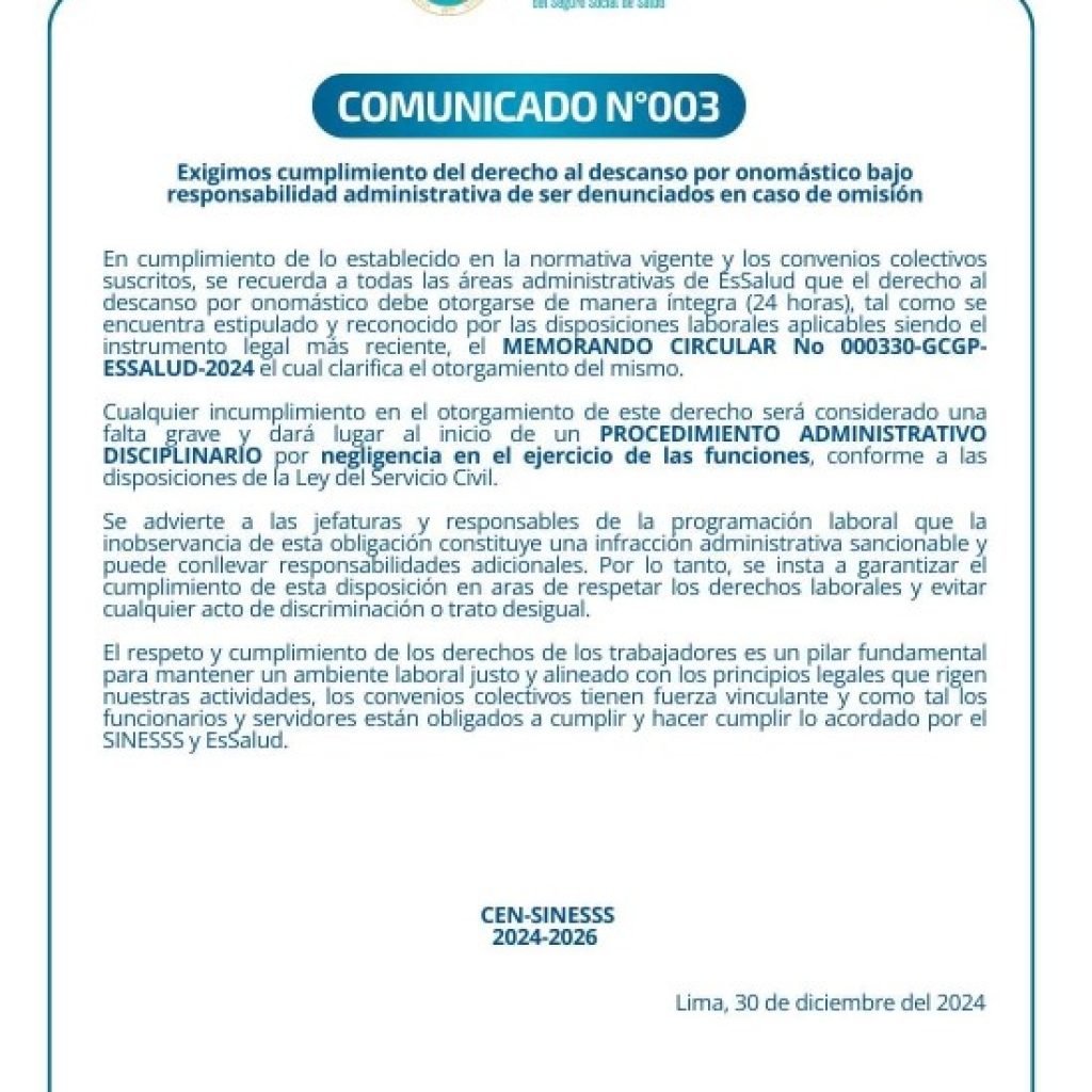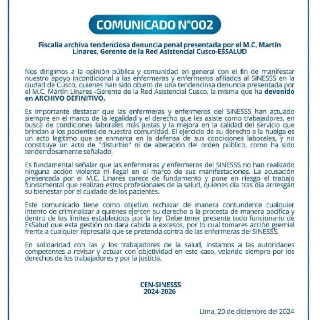 El Sindicato Nacional de Enfermeras del Seguro Social de Salud (SINESSS) fue fundado el 18 de octubre de 1977 y consolidado jurídicamente el 13 de diciembre del mismo año.