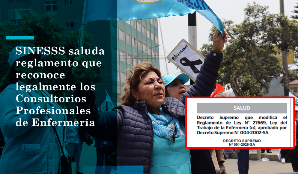 Lima, 19 de enero del 2026. El Sindicato Nacional de Enfermeras del Seguro Social de Salud del Perú (SINESSS) expresa su respaldo a la reciente publicación del reglamento que regula la operación y funcionamiento de los Consultorios Profesionales de Enfermería, aprobado mediante Decreto Supremo N.° 004-2026-SA. Esta medida, dispuesta por el Poder Ejecutivo, constituye un avance normativo de gran importancia para el fortalecimiento del rol estratégico de las enfermeras y enfermeros en la atención primaria de salud en el país.